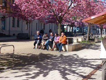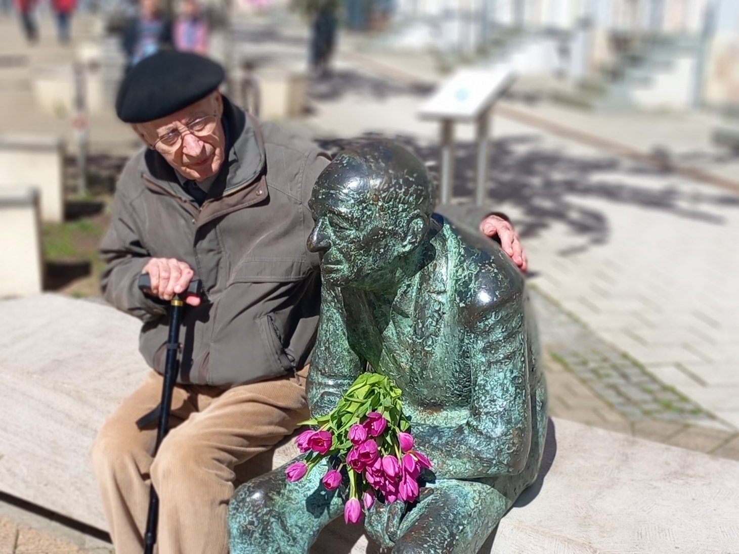 Am 23.April 1945 waren die Häftlinge eines "Todesmarsches" des KZ Flossenbürg in einer Scheune bei Wetterfeld im Bayern zusammengefercht. Noch unter Bewachung der SS wagten sie den Ausbruch ins Freie, als sie Geräusche schweren Kriegsgeräts, Rasseln von Panzerketten hörten und durch Ritzen im Holzverschlag eindeutig Sterne auf den Fahrzeugen wahrgenommen hatten. Ein Tag der Befreiung und ab diesem Jahr Justins zweiter Geburtstag, den er Zeit seines Lebens feierte und an den wir jährlich erinnern. Auch in diesem Jahr haben wir gefeiert. Der Brühl stand in Blütenbracht und es fanden sich Chemnitzerinnen und Chemnitzer, Freunde unseres Kameraden, um dieses Datum gemeinsam bei Kaffee und Kuchen zu begehen. Begrüßen konnten wir auch Mykola Borovyk den wissenschaftlichen Mitarbeiter der Stadt Frankennberg, der mit dem Aufbau der Gedenkstätte für das KZ Sachsenburg betraut ist sowie den Sohn von Max Brudner. Hermanns Vater, Kommunist aus Chemnitz, war Kapo im KZ Auschwitz und hatte Justin im Lager entscheidend begleitet uns somit zu seinem Überleben beigetragen.