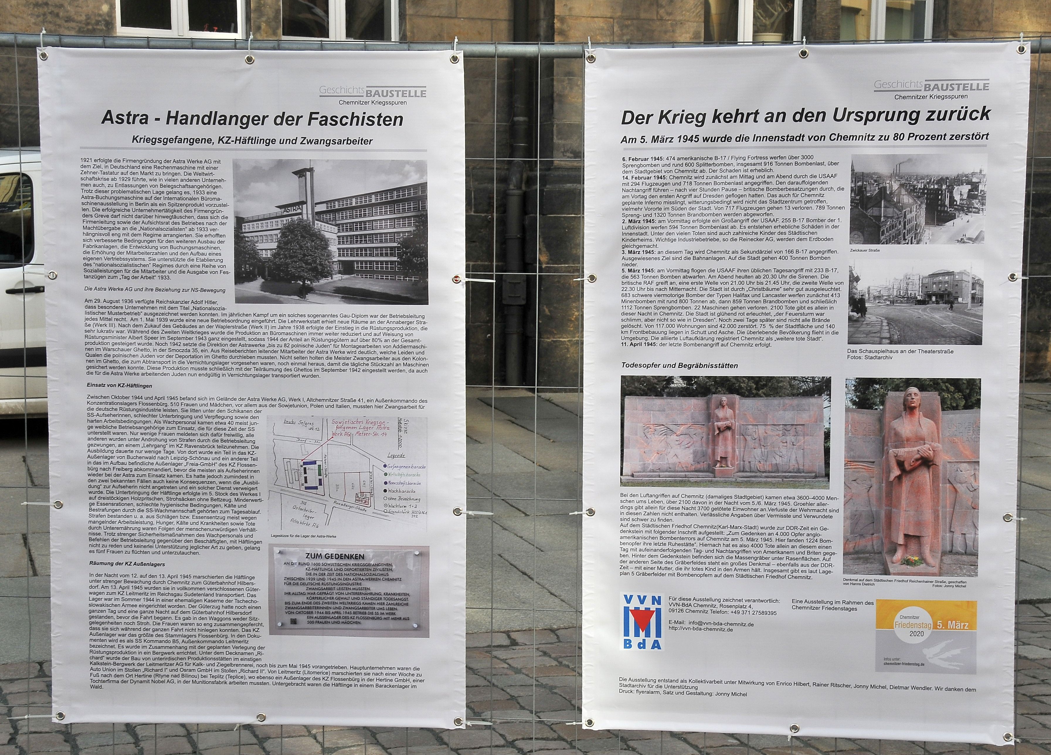 Am Anfang stand die Ausstellung "Geschichtsbaustelle" (siehe Fotos unten). Sie ist als Wanderausstellung konzipiert und kann vor allem unter freiem Himmel gezeigt werden. Schulen, Vereine, Kultur- und öffentliche Einrichtungen leihen diese Ausstellung, um vor allem Jugendlichen den Zusammenhang zwischen dem Aufkommen des deutschen Faschismus und dem Zerstören unserer Städte zu verdeutlichen - ein Anliegen, das gerade in heutiger Zeit, in der neue und alte Faschisten ihre Fahnen schwenken sehr wichtig ist...